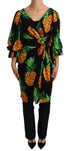 Black Ananas Print Wrap Stretch Silk Dress