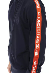 Embrace the boldness of Automobili Lamborghini with this sleek sweatshirt, featuring a striking front printed shield logo that captures the essence of the iconic brand. Crafted for the style-conscious, this zippered piece comes complete with convenient side pockets and an eye-catching band along the sleeves adorned with the repeated Lamborghini lettering logo. Made from a premium blend of polyester, cotton, and elastane for ultimate comfort, this sweatshirt stands out in a dynamic blue, adding a trendy touch to your wardrobe, ready to rev up your casual look.