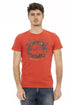 Elevate your casual wardrobe with the striking aesthetic of Trussardi Action. This bold red T-shirt, featuring a dynamic front print, embodies modernity and style. Crafted from a luxurious blend of cotton and viscose, it promises comfort and durability. Designed for the contemporary man, this tee with a classic round neck and short sleeves will make a statement wherever you go.